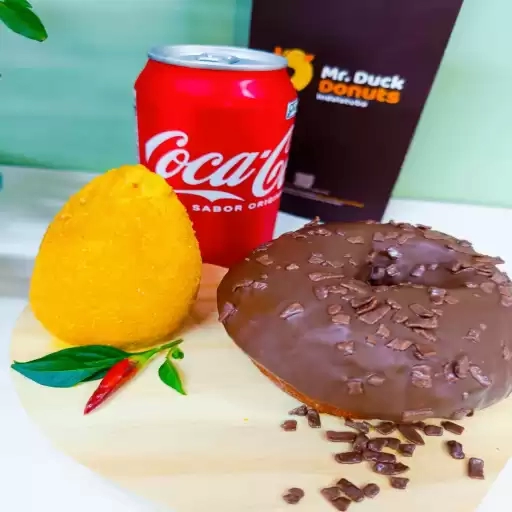 Donuts chocolate ao leite+coxinha de frango+coca 350ml
